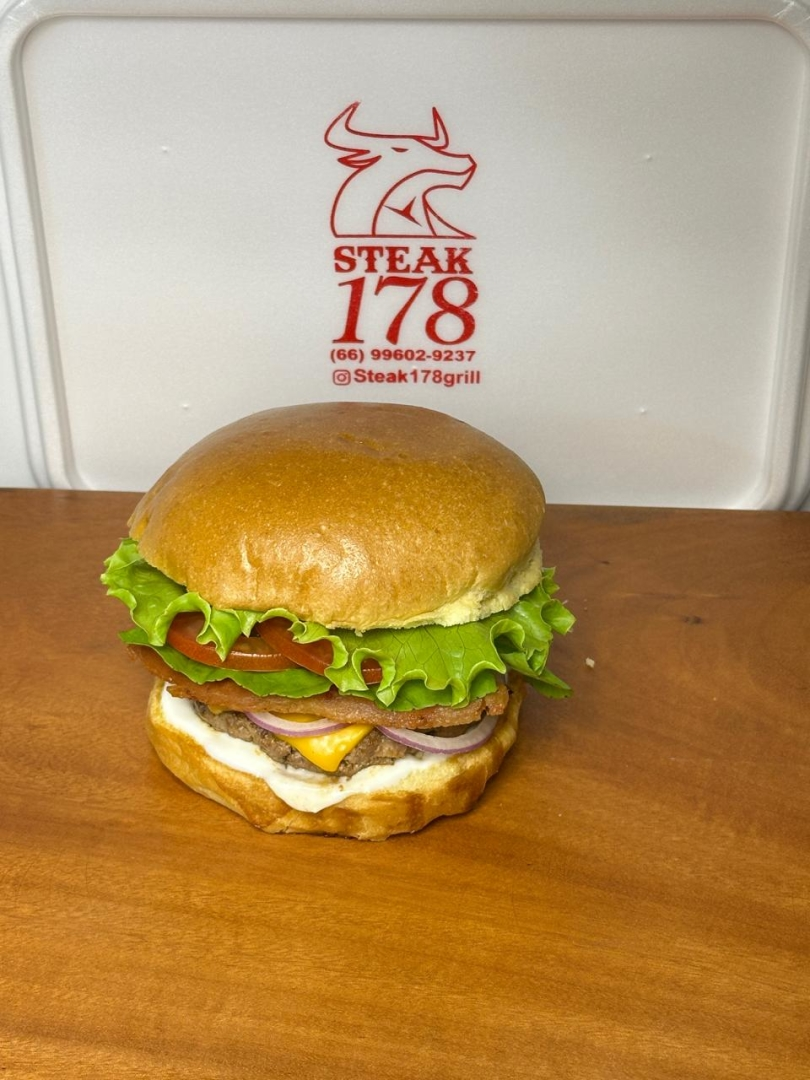 PÃO BRIOCHE TOSTADO NA MANTEIGA, BLEND DE 160GR, MUSSARELA, ALFACE, TOMATE, BACON, MAIONESE STEAK.