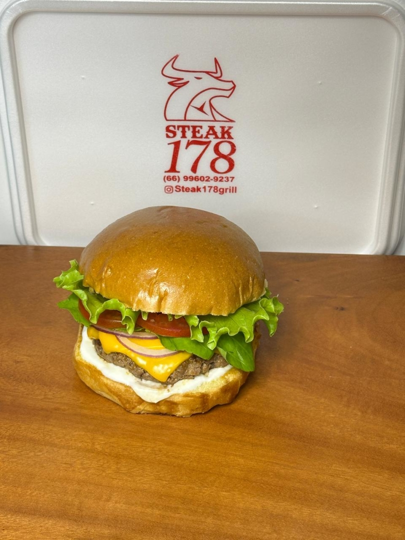 PÃO BRIOCHE TOSTADO NA MANTEIGA, BLEND DE 160GR, CHEDDAR, CEBOLA ROXA, ALFACE, TOMATE, RÚCULA, MAIONESE STEAK.